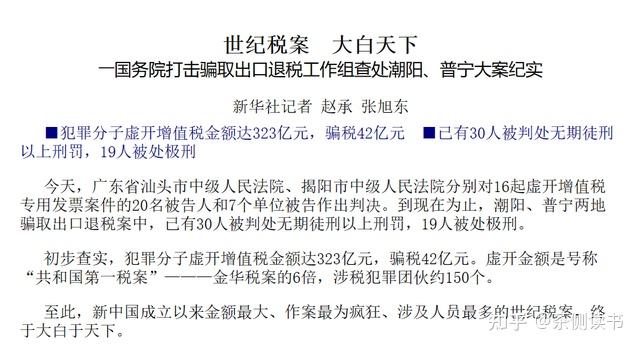 此案中,犯罪分子虚开增值税金额达323亿元,骗税42亿元。涉税犯罪团伙约150个,30人被判处无期徒刑以上刑罚,19人被处死刑。党政机关、执法部门及其他部门中,共有328名涉案人员被调查。