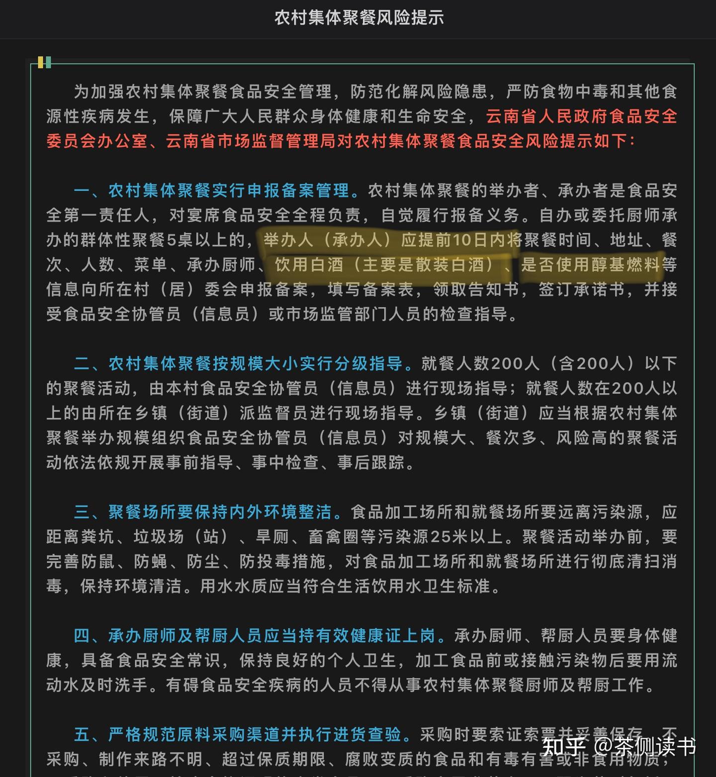 “云南市场监管”公众号发布《农村群体聚餐风险提示》,要求“提前10日内将聚餐时间、地址、餐次、人数、菜单、承办厨师、饮用白酒(主要是散装白酒)、是否使用醇基燃料等”备案。