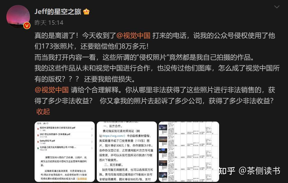 8月15日,星空摄影师戴建峰(微博@Jeff的星空之旅 )发布,“视觉中国”通知他,他的公众号有173张图片属于侵权,需要赔偿8万元。