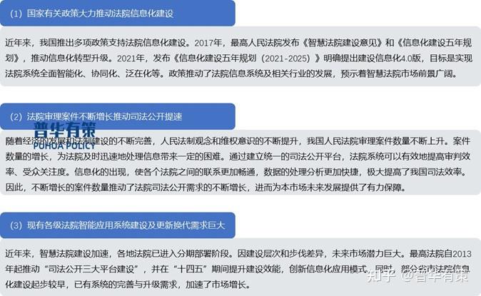 法院信息化建设和司法改革同等重要,这对行业来说是利好,同时也对行业企业提出了更加全面的创新要求。《人民法院信息化建设五年发展规划(2019-2023)》提出以促进审判体系和审判能力现代化为目标的发展思路,建成人民法院信息化3.0版,形成支持全业务网络办理,全流程审判执行要素依法公开,面向法官、诉讼参与人、社会公众和政务部门提供全方位智能服务的智慧法院。