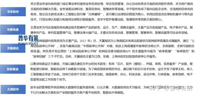 智慧法院领域的主要包括华宇软件、华夏电通、如天翼视讯、东软载波和久其软件等企业,其中,天翼视讯主要为江西、安徽、上海地区的法院提供科技法庭技术服务业务,东软载波的法院软件产品应用于全国300多家法院。具体如下: